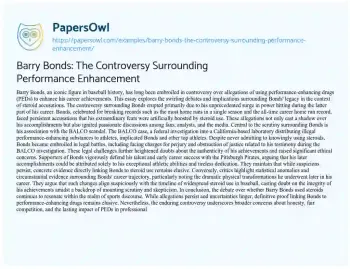 This essay is about Barry Bonds and the controversy over his alleged use of performance-enhancing drugs (PEDs) to achieve his baseball records. It examines the debates and implications of his association with the BALCO scandal and legal battles, as well as the arguments from both supporters and critics regarding his career achievements. The essay highlights the ongoing discussions about fairness and integrity in professional sports.