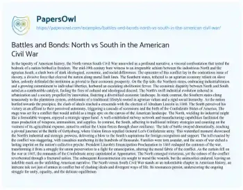 This essay about the North versus South Civil War into the profound narrative that unfolded in the mid-19th century, testing the very foundations of a nation forged in freedom. A clash born of ideological, economic, and social disparities, the conflict’s epicenter lay in the contentious issue of slavery. The narrative explores the combustible catalyst of economic disparity, with the North’s industrial evolution contrasting sharply with the South’s adherence to agrarian traditions. The crescendo of ideals reached its peak with Abraham Lincoln’s election in 1860, leading to a tragic epic on the American landscape. The essay reflects on pivotal moments like the Battle of Gettysburg, the toll exacted by the conflict, and the transformative impact of the Emancipation Proclamation. It concludes by examining the enduring echoes of the war on the nation’s identity and the ongoing struggle for unity and equality. You can also find more related free essay samples at PapersOwl about American Civil War.