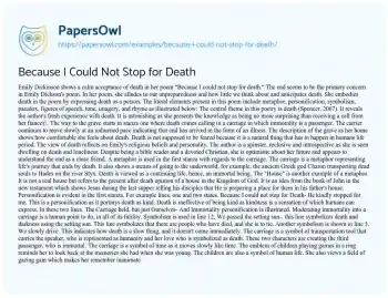 This essay will provide an analysis of Emily Dickinson’s poem “Because I Could Not Stop for Death.” It will explore the themes of mortality, the passage of time, and the eternal nature of death. The piece will examine Dickinson’s use of imagery, symbolism, and her distinctive style to convey her contemplations on death and the afterlife. Moreover, at PapersOwl, there are additional free essay samples connected to Death.