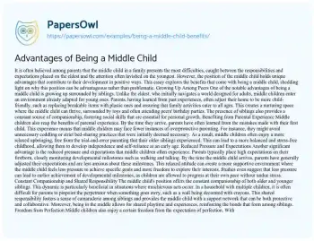 This essay will discuss the unique benefits of being a middle child. It will explore how middle children often develop strong negotiation skills, independence, and adaptability due to their position in the family. The piece will examine psychological studies and anecdotal evidence regarding the character traits and advantages often associated with middle children. At PapersOwl too, you can discover numerous free essay illustrations related to Child.