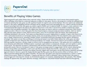 This essay will discuss the benefits of playing video games, challenging the common negative perceptions. It will cover cognitive, social, and emotional advantages, such as improved problem-solving skills, enhanced hand-eye coordination, and opportunities for social interaction. The piece will also consider the educational potential of video games and their role in skill development. Moreover, at PapersOwl, there are additional free essay samples connected to Video Game.