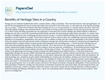 Heritage sites are important landmarks that reflect a country's history, culture, and identity. These sites hold immense value and significance, not only for the local population but also for tourists and visitors from around the world. In this essay, we will explore the seven benefits of heritage sites in a country.