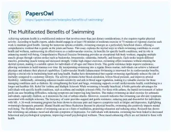 This essay will outline the numerous benefits of swimming. It will cover its physical, mental, and therapeutic advantages, making it a recommended activity for people of all ages. More free essay examples are accessible at PapersOwl about Asthma.