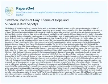 This essay will analyze the themes of hope and survival in Ruta Sepetys’ “Between Shades of Gray.” It will discuss how the novel portrays the resilience of the human spirit in the face of hardship during the Soviet occupation of the Baltic states. PapersOwl showcases more free essays that are examples of Hope.