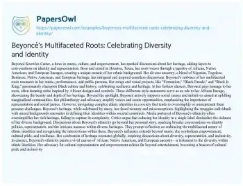 Beyoncé's Multifaceted Roots: Celebrating Diversity and Identity. (2023, Dec 22). Retrieved from https://hub.papersowl.com/examples/beyonces-multifaceted-roots-celebrating-diversity-and-identity/