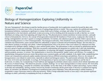 This essay delves into the concept of “homogenization,” exploring its diverse applications and implications beyond its common association with dairy processing. It begins by explaining homogenization in the food industry, particularly in dairy, where it involves creating a consistent texture and taste in milk. The essay then expands this concept to biological contexts, examining how genetic and ecological homogenization affects species diversity and raises concerns about vulnerability to environmental changes. Furthermore, it explores cultural homogenization, highlighting the impact of global influences on local cultures and the potential loss of cultural diversity. In the realm of technology and industry, the essay discusses the importance of standardization for quality control and efficiency. However, it also addresses the controversies surrounding homogenization, especially in cultural and biological spheres, where it can conflict with the values of diversity and individuality. The essay concludes by emphasizing the complexity of balancing the benefits of uniformity with the preservation of diversity, underscoring the multifaceted nature of the homogenized definition across various fields. Moreover, at PapersOwl, there are additional free essay samples connected to Biology
