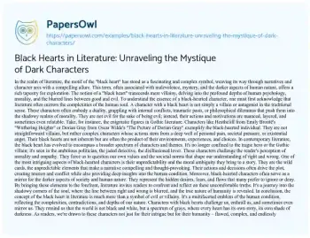 This essay delves into the intriguing motif of “black hearts” in literature, exploring how this symbol transcends traditional villainy to reflect the deeper complexities of human nature. It argues that characters with black hearts are not merely evil, but instead embody a nuanced blend of morality, internal conflict, and the influence of their environments and experiences. The essay highlights examples from Gothic literature, such as Heathcliff from “Wuthering Heights” and Dorian Gray from “The Picture of Dorian Gray,” to illustrate how these characters are products of their surroundings and personal struggles. It also discusses the evolution of the black-hearted character in contemporary literature, emphasizing their role in challenging readers’ perceptions of morality and empathy. These characters are portrayed as mirrors to society’s darker aspects and human flaws, inviting introspection and reflection on uncomfortable truths. Overall, the essay presents the black heart as a complex and multifaceted literary device that reveals the gray areas of morality and the intricate tapestry of the human soul. Additionally, PapersOwl presents more free essays samples linked to Literature.
