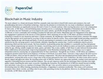 This essay will explore the impact of blockchain technology on the music industry. It will discuss how blockchain can revolutionize music distribution, rights management, and artist compensation. PapersOwl showcases more free essays that are examples of Blockchain.