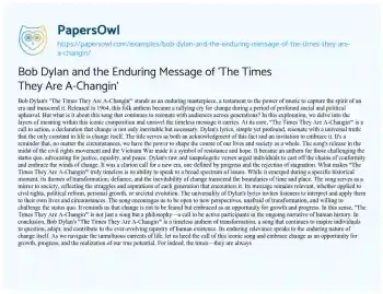 Dive into the timeless significance of Bob Dylan’s “The Times They Are A-Changin'” in this captivating essay. Explore how this iconic folk anthem has transcended generations, serving as a rallying cry for change and a mirror to society’s struggles. Uncover the profound message within the song’s simple yet powerful lyrics—a message that challenges us to embrace transformation, defy the status quo, and shape our destinies. Discover why this song remains a poignant reminder that change is not to be feared but welcomed as an opportunity for growth and progress. Join us on a journey through the enduring relevance of Dylan’s masterpiece and its call to be active participants in the ongoing narrative of human history. Also at PapersOwl you can find more free essay examples related to Bob Dylan.