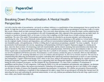 This essay about the intricate relationship between procrastination and mental health reframes the common narrative around procrastination, presenting it not as simple laziness but as a complex interaction with our emotional well-being. It explores how procrastination can be both a symptom and a contributor to conditions like anxiety, depression, low self-esteem, and perfectionism. The discussion highlights the cyclical nature of this relationship, where procrastination and mental health issues perpetuate each other, making it a challenging cycle to break. The essay suggests cognitive-behavioral therapy, practical time management strategies, mindfulness, and self-compassion as effective tools for managing procrastination in the context of mental health. By understanding and addressing the emotional roots of procrastination, the essay argues, individuals can overcome this pattern, leading to improved mental health and productivity. PapersOwl offers a variety of free essay examples on the topic of procrastination.