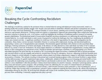 This essay about the challenge of recidivism, explores the persistent return to criminal behavior among previously incarcerated individuals and the societal struggles in addressing it. It highlights the limitations of traditional punitive measures and emphasizes the need for comprehensive solutions that address socio-economic, psychological, and systemic factors. The text into the barriers faced by ex-offenders in reintegrating into society, including lack of opportunities, social stigma, and discrimination. It advocates for systemic reforms, including rehabilitative programs and restorative justice principles, as well as community engagement to support individuals transitioning from incarceration to freedom. Overall, the essay stresses the importance of prioritizing rehabilitation over punishment and fostering inclusivity to break the cycle of crime and build safer communities.