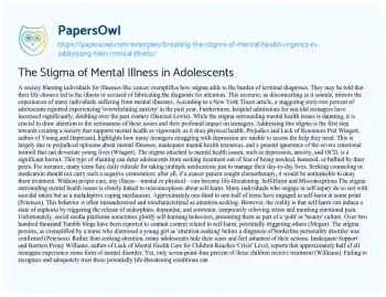 The Stigma of Mental Illness in Adolescents. (2023, Jun 15). Retrieved from https://hub.papersowl.com/examples/breaking-the-stigma-of-mental-health-urgency-in-addressing-teen-mental-illness/