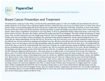 A comprehensive overview of current strategies and methods in place for breast cancer prevention (like screenings and lifestyle adjustments) and the range of treatments available, from surgeries to chemotherapy and radiation, as well as the emerging treatments in the pipeline. Moreover, at PapersOwl, there are additional free essay samples connected to Breast Cancer topic.