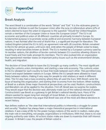 Nye defines realism as "the view that international politics is inherently a struggle for power and security." Realism has always been a major theoretical perspective in international relations. It was a way of life for the power hungry nations of the world. In realism, states play the main role in everything, not people, organizations or institutions. With that, there is no over reigning authority over states. All actions states make are down to maximize their self-interest of power. In Britain's case, the people of Britain voted with a realistic perspective. Brexit proved that the EU did not own Britain, nor could it force them to comply with things that were not in their best interest. Paul Schnapper of "British foreign policy in the case of Brexit states", "this looks like a return to a traditional nationalist, power-based realist foreign policy, at least in the rhetoric of Brexiters, who want to turn their backs on over 40 years of multilateral rules-based cooperation in Europe in favour of global agreements reminiscent of the UK's glorious imperial past".