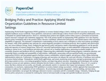 This essay about bridging the gap between policy and practice in healthcare by implementing WHO guidelines in resource-limited settings. It discusses the challenges of translating global health policies into actionable measures within constrained environments, emphasizing the importance of contextual adaptation, stakeholder collaboration, and technological innovation. The essay underscores the significance of empowering local healthcare providers, leveraging community engagement, and embracing innovative solutions to address healthcare disparities effectively. Ultimately, it advocates for a comprehensive approach that prioritizes sustainability and equity in healthcare delivery, aiming to improve health outcomes for vulnerable populations worldwide.