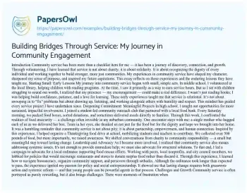 Building Bridges Through Service: My Journey in Community Engagement. (2025, May 30). Retrieved from https://hub.papersowl.com/examples/building-bridges-through-service-my-journey-in-community-engagement/