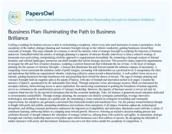This essay is about the vital role of strategic planning and visionary foresight in steering businesses toward success. It emphasizes the importance of meticulous analysis and proactive decision-making in navigating the complexities of the market landscape. By crafting a resilient framework grounded in strategic acumen, businesses can weather the storms of uncertainty and capitalize on emerging opportunities. The essay draws parallels between corporate giants like Apple Inc. and grassroots enterprises, highlighting the universal applicability of strategic principles. It underscores the transformative power of visionary leadership, exemplified by trailblazers such as Elon Musk. Moreover, the essay stresses the imperative of adaptability and inclusivity in fostering innovation and resilience. It concludes by asserting that businesses equipped with strategic foresight are poised to shape their destinies and leave a lasting legacy in the annals of history. You can also find more related free essay samples at PapersOwl about Bussiness Plan.