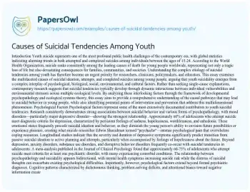 Causes of Suicidal Tendencies Among Youth. (2025, Apr 21). Retrieved from https://hub.papersowl.com/examples/causes-of-suicidal-tendencies-among-youth/