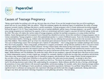 This essay will explore the various causes of teenage pregnancy. It will delve into factors such as lack of sexual education, socio-economic status, family dynamics, peer pressure, and media influence. The piece will also discuss the role of access to contraception and healthcare services in preventing teenage pregnancy. Additionally, it will consider the psychological and societal impacts that contribute to this issue, providing a comprehensive understanding of the complexities surrounding teenage pregnancy. PapersOwl offers a variety of free essay examples on the topic of Adolescence.