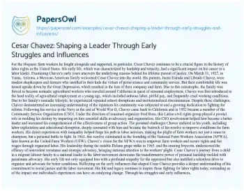 Cesar Chavez: Shaping a Leader Through Early Struggles and Influences. (2024, Jun 28). Retrieved from https://hub.papersowl.com/examples/cesar-chavez-shaping-a-leader-through-early-struggles-and-influences/