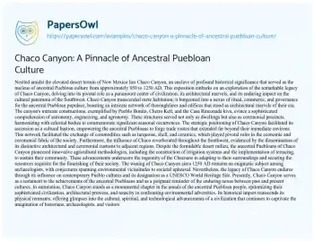 Chaco Canyon: A Pinnacle of Ancestral Puebloan Culture. (2024, Mar 12). Retrieved from https://hub.papersowl.com/examples/chaco-canyon-a-pinnacle-of-ancestral-puebloan-culture/