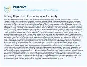 In her essay "Changing the Face of Poverty," Diana George critically examines the portrayal of poverty by organizations like Habitat for Humanity. Although these organizations aim to address poverty and inadequate housing, George argues that their methods may inadvertently perpetuate stereotypes and misconceptions about poverty. Through her engagement with these issues, George suggests that the focus of these organizations often skews towards an oversimplified portrayal of poverty, as seen in their emphasis on third-world countries. This essay will explore George's critique and consider the validity of her arguments while reflecting on the broader implications of how poverty is represented in nonprofit advocacy.