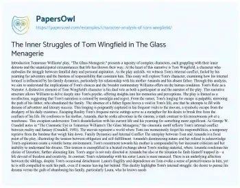 This essay will analyze the character of Tom Wingfield in Tennessee Williams’ “The Glass Menagerie.” It will discuss Tom’s role as the narrator and a character, his dreams and frustrations, and his complex relationships with his family. The piece will examine how Tom’s character reflects the themes of memory, escape, and responsibility. More free essay examples are accessible at PapersOwl about Analysis.