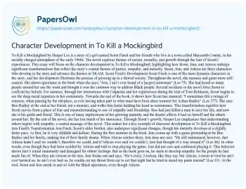 This essay will analyze the character development in Harper Lee’s “To Kill a Mockingbird.” It will focus on the growth and changes in key characters like Scout, Jem, and Atticus Finch. The piece will explore how the events in the story, particularly those related to racial injustice and moral dilemmas, contribute to the characters’ development. It will also discuss how these characters’ evolutions reflect the broader themes of the novel, including empathy, integrity, and the loss of innocence. Additionally, PapersOwl presents more free essays samples linked to To Kill A Mockingbird.