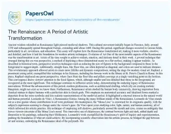 The Renaissance: A Period of Artistic Transformation. (2021, Apr 26). Retrieved from https://hub.papersowl.com/examples/characteristics-of-the-renaissance/