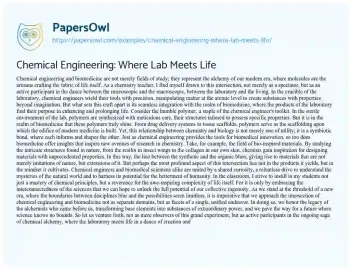 This essay is about the intricate relationship between chemical engineering and biomedicine, exploring how these fields converge to shape the fabric of modern science. It discusses the synergy between the laboratory and the living, highlighting how chemical engineers manipulate molecules to create substances with biomedical applications. The essay emphasizes the symbiotic bond between chemistry and biology, where each informs and inspires the other. It also touches upon the interdisciplinary nature of bio-inspired materials, showcasing how insights from nature drive innovation in synthetic materials. Ultimately, the essay underscores the importance of embracing the interconnectedness of the sciences to unlock the full potential of human ingenuity in advancing healthcare and technology.