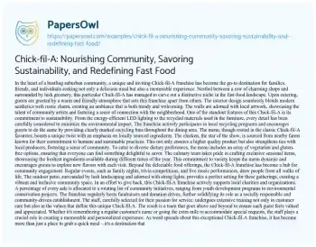 In this essay, explore the unique attributes of a Chick-fil-A franchise that distinguish it from conventional fast-food establishments. Delve into its commitment to sustainability, utilizing locally sourced ingredients and eco-friendly practices. Highlight the franchise’s role in fostering community engagement through events, fundraisers, and support for local initiatives. Discuss the distinctive menu offerings, incorporating seasonal and diverse options to cater to various dietary preferences. Emphasize the warm and inviting ambiance, complemented by a socially responsible staff dedicated to creating a personalized experience for guests. Ultimately, the essay encapsulates how this Chick-fil-A franchise transcends the ordinary, evolving into a community-oriented, environmentally conscious, and culinary innovative establishment that redefines the fast-food experience. Moreover, at PapersOwl, there are additional free essay samples connected to Fast Food.
