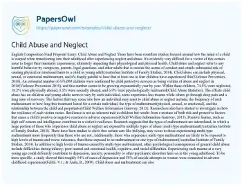 This essay will provide an in-depth look at child abuse and neglect. It will discuss the various forms of abuse, indicators of neglect, the long-term consequences for children, and strategies for intervention and prevention. Moreover, at PapersOwl, there are additional free essay samples connected to Abuse.