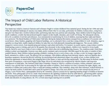 The Impact of Child Labor Reforms: A Historical Perspective. (2020, May 12). Retrieved from https://hub.papersowl.com/examples/child-labor-in-late-the-1800s-and-early-1900s/
