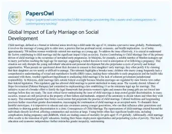 Global Impact of Early Marriage on Social Development. (2020, Feb 22). Retrieved from https://hub.papersowl.com/examples/child-marriage-uncovering-the-causes-and-consequences-in-contemporary-society/
