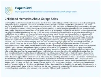 Share a collection of childhood memories centered around garage sales. This piece can include personal anecdotes of finding treasures, learning negotiation skills, and understanding the value of items beyond monetary worth. It can also reflect on garage sales as a window into community life and childhood wonder. PapersOwl offers a variety of free essay examples on the topic of Childhood.
