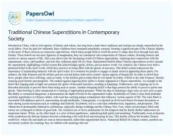 This essay will delve into various Chinese superstitions, discussing their historical origins, cultural significance, and how they continue to influence modern Chinese society and practices. At PapersOwl too, you can discover numerous free essay illustrations related to Supernatural.