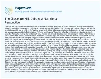 This essay will delve into the controversy surrounding chocolate milk in school nutrition programs. It will discuss the nutritional benefits and drawbacks, and explore differing viewpoints from health experts, educators, and parents. At PapersOwl too, you can discover numerous free essay illustrations related to Chocolate.