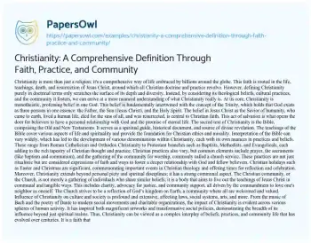 Christianity: A Comprehensive Definition Through Faith, Practice, and Community. (2024, May 12). Retrieved from https://hub.papersowl.com/examples/christianity-a-comprehensive-definition-through-faith-practice-and-community/