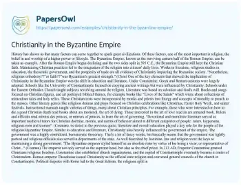 This essay will explore the role and evolution of Christianity in the Byzantine Empire. It will discuss how Christianity influenced Byzantine culture, politics, and art. The piece will examine key events such as the Iconoclastic Controversy and the Great Schism, and how these shaped the religious landscape of the empire. It will also consider the lasting legacy of Byzantine Christianity on the Eastern Orthodox Church and Christian history. More free essay examples are accessible at PapersOwl about Byzantine Empire.