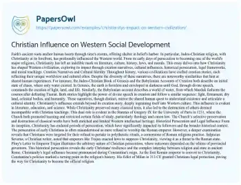 This essay will examine the profound impact of Christianity on Western civilization. It will cover the religion’s influence on art, culture, law, ethics, and science throughout history. The piece will discuss how Christian values and teachings have shaped Western societal norms and thought. Also at PapersOwl you can find more free essay examples related to Christianity.