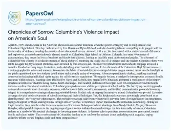 Chronicles of Sorrow: Columbine's Violence Impact on America's Soul. (2024, Feb 27). Retrieved from https://hub.papersowl.com/examples/chronicles-of-sorrow-columbines-violence-impact-on-americas-soul/