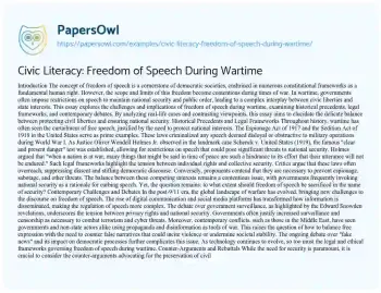 In conclusion, the issue of freedom of speech during wartime presents a complex and multifaceted challenge for democratic societies. While national security concerns may necessitate certain restrictions, it is imperative to ensure that these measures do not infringe unduly on fundamental civil liberties. Historical precedents and contemporary debates underscore the importance of maintaining a delicate balance between security and freedom. By critically examining legal frameworks, real-life cases, and counter-arguments, this essay has sought to illuminate the ongoing tension between civic literacy and state interests. Ultimately, safeguarding freedom of speech, even in times of crisis, is essential to the preservation of democratic values and the promotion of a resilient society.