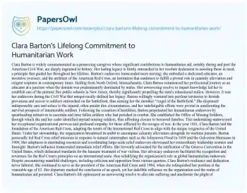 Clara Barton's Lifelong Commitment to Humanitarian Work. (2024, Jun 01). Retrieved from https://hub.papersowl.com/examples/clara-bartons-lifelong-commitment-to-humanitarian-work/