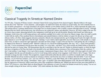 This essay will examine the elements of classical tragedy present in Tennessee Williams’ “A Streetcar Named Desire.” It will explore themes of downfall, fate, and tragic flaws in its characters. PapersOwl showcases more free essays that are examples of A Streetcar Named Desire.