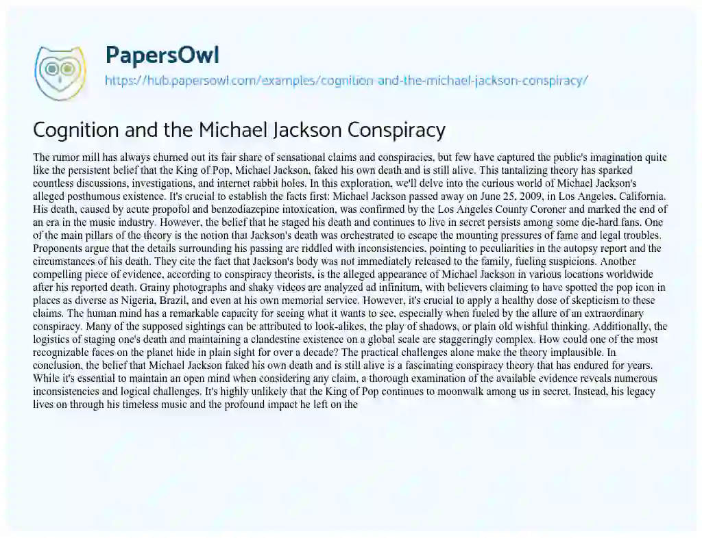 Dive into the intriguing world of conspiracy theories with “Unraveling the Mystery: Is Michael Jackson Still Alive?” This essay delves into the persistent belief that the King of Pop, Michael Jackson, faked his own death and continues to secretly live among us. Explore the evidence put forth by proponents of this theory and examine the inconsistencies and challenges that cast doubt on its validity. Discover the complexities of maintaining a clandestine existence on a global scale and why, despite the allure of such a sensational claim, it remains highly improbable. Join us in separating fact from fiction and exploring the enduring legacy of one of music’s greatest icons. Additionally, PapersOwl presents more free essays samples linked to Cognition.