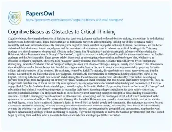 Cognitive biases obstruct our ability to think critically by distorting our perceptions and judgments. They hinder our capacity to evaluate evidence objectively and can lead to disastrous consequences, as illustrated in both *Pocahontas* and the Holocaust. To overcome these biases, we must cultivate a mindset open to diverse perspectives and grounded in evidence-based reasoning. Engaging in dialogue, questioning assumptions, and seeking to understand others are essential steps in dismantling biases and fostering a more inclusive and critically aware society.