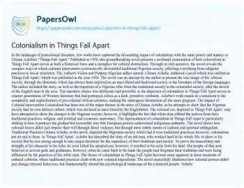 This essay will examine the theme of colonialism in Chinua Achebe’s “Things Fall Apart.” It will discuss how the novel portrays the effects of colonialism on Igbo society, focusing on cultural conflicts, the impact on traditional values, and the clash between indigenous and colonial systems. The piece will also consider Achebe’s critique of the colonial narrative and his portrayal of the complexity and richness of Igbo culture. At PapersOwl too, you can discover numerous free essay illustrations related to Chinua Achebe.