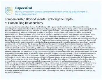 This essay delves into the intricate and profound bond between humans and dogs. It explores how this unique relationship has evolved over thousands of years, shaping not just individual lives but also societal structures. The essay highlights the emotional depth of this bond, emphasizing dogs’ ability to empathize with human emotions and their role in therapeutic settings. It also addresses the complexities of this relationship, including the challenges of humanizing dogs and the need to understand their distinct psychological and social needs. The impact of environmental and societal factors on this bond, particularly in different settings like urban and rural areas, is also discussed. This reflective piece offers insights into the multifaceted nature of the human-dog bond, emphasizing its significance in our lives and the importance of respecting the innate characteristics of our canine companions. Also at PapersOwl you can find more free essay examples related to Dog