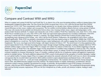This essay will compare and contrast World War I and World War II, focusing on their causes, conduct, and consequences. It will discuss the differences in warfare technology and tactics, the global impact of each war, and the political and social changes they brought about. The piece will also examine how the outcomes of World War I set the stage for World War II, and how the two wars reshaped international relations and the global order in the 20th century. At PapersOwl, you’ll also come across free essay samples that pertain to Conflicts.