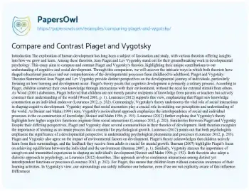 This essay will compare the educational theories of Jean Piaget and Lev Vygotsky. It will discuss their views on cognitive development in children, focusing on concepts like developmental stages, the role of social interaction, and the application of these theories in educational settings. The piece will highlight the differences and similarities in their approaches. PapersOwl offers a variety of free essay examples on the topic of Behavior.